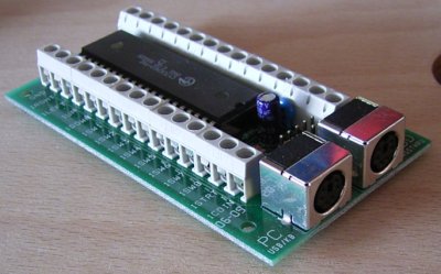 In der Planungsphase habe ich mir ein Controlpanel zum Testen gebaut. Als Schnittstelle zwischen den Bedienelementen wie Joysticks, Buttons und Tastatur und dem Computer benutze ich ein I-Pac² von Ultimarc.com. Damit kann man 28 Funktionen direkt, und weitere über einen frei definierbaren Shift-Button ansteuern. Die Tastatur läßt sich durch den eingebauten PS2-Anschluß parallel benutzen. Das I-Pac selbst wird per USB-Kabel mit dem Rechner verbunden. Zum programmieren des I-Pacs gibt es für Linux das Kommandozeilenprogramm Ipacutil. Ich werde es später mal ausprobieren, erstmal reichen mir die vorkonfigurierten Buttons zum testen.