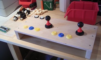 Der Rohbau meines Test-Controlpanels. Ich habe pro Spieler jeweils einen Joystick und 3 Knöpfe vorgesehen und dazu Player 1 und 2 und Coin 1. Das reicht zum ausprobieren auf jeden Fall aus, den Rest übernimmt noch die angeschlossene Tastatur.