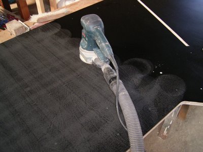 Der getrocknete Lack wird mit dem Exzenterschleifer und feinem Schleifpapier leicht angeschliffen.Dabei sollte die weiße Grundierung nicht wieder zu sehen sein, der schwarze Lack muß überall gleichmäßig matt aussehen.
