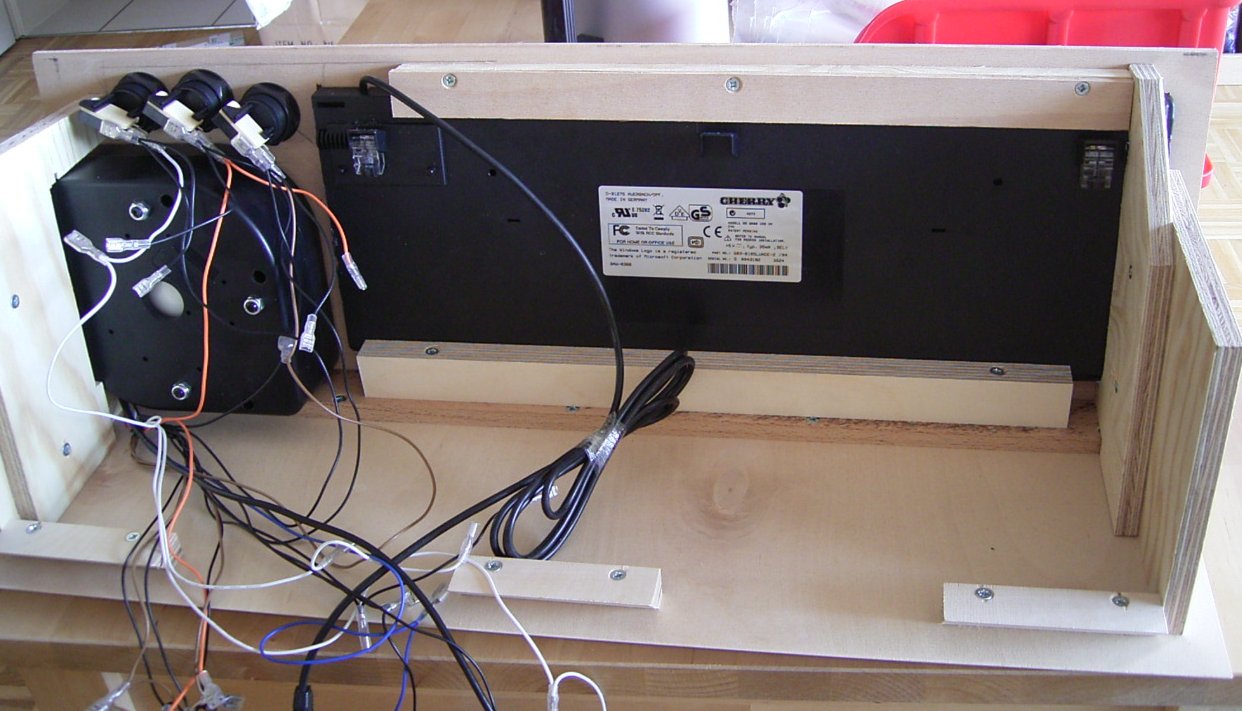 Als erstes baue ich ein Controlpanel mit Tastatur und einem Trackball als Ersatz für die Maus. Damit kann ich den Rechner administrieren, PC-Spiele spielen und im Internet surfen. Da alles per USB angeschlossen wird kann das Tastatur-Panel auch im laufenden Betrieb angeschlossen werden.